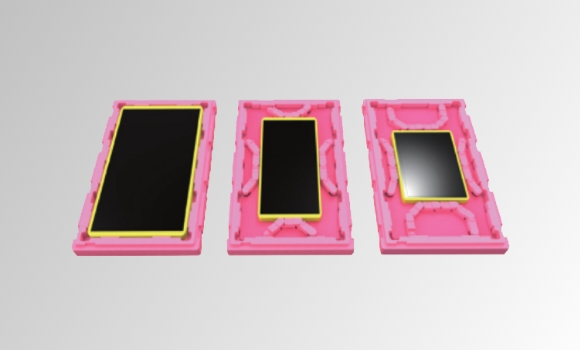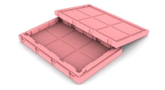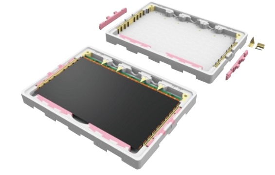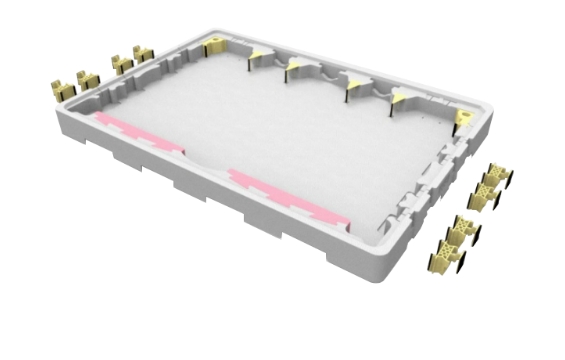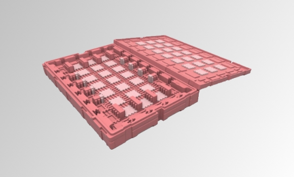 TFT-LCD 面板尺寸多样化是不可避免的趋势,也因此导致停产机种产生大量闲置玻璃运输箱,“移动式档块设计”于箱底及箱盖预留固定卡槽,让档块可垂直和水平移动以调整装片尺寸,即使产品停产后也能藉改变文件块位置再给其他新机种使用,可达成运输箱重复使用并减少新模具开发费用; 且档块是由两种发泡倍率堆栈,低倍率用以固定文件块位置, 高倍率则提供缓冲用以提升保护性;档块可藉由箱底及箱盖卡槽固定于任意位置,不需多余料件支撑于墙面可节省材料成本,甚至可依需求装载不同尺寸面板以增加共享性, 减少新包材的开发。