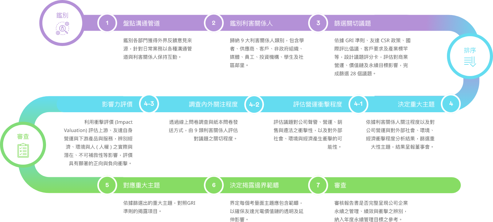 依循全球永續趨勢與 GRI 準則檢視議題之合適性,透過問卷瞭解利害關係人對公司在環境、社會 ( 含人權 )、公司治理三方面的關注面向,同時 建立雙重重大性評估方法,透過haobotiyu-好博(中國)主管與價值鏈的關鍵夥伴評估 ESG 議題對公司所產生的營運衝擊程度,並在 ESG 外部永續發展衝擊方面,根據 GRI 通用準則 2021(GRI Universal Standards 2021) 的 GRI 3: 重大主題 (Material Topics 2021),整合價值平衡聯盟 (Value Balancing Alliance, VBA)、哈佛商學院「影響力加權會計 (Impact-Weighted Accounts)」研究計畫等機構發展之經濟、環境及社會層面衝擊評估方法學,建構以衝擊為基礎的重大性分析流程,辨識重大性主題。