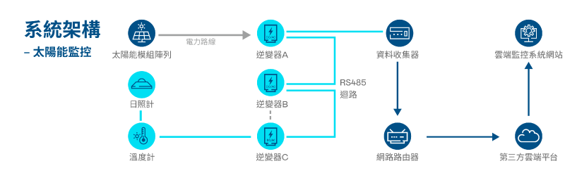 具有高穩定性高相容性及簡易安裝等特色,支援市面上所有型號的逆變器、電錶、類比數位轉換器及氣象感測器。