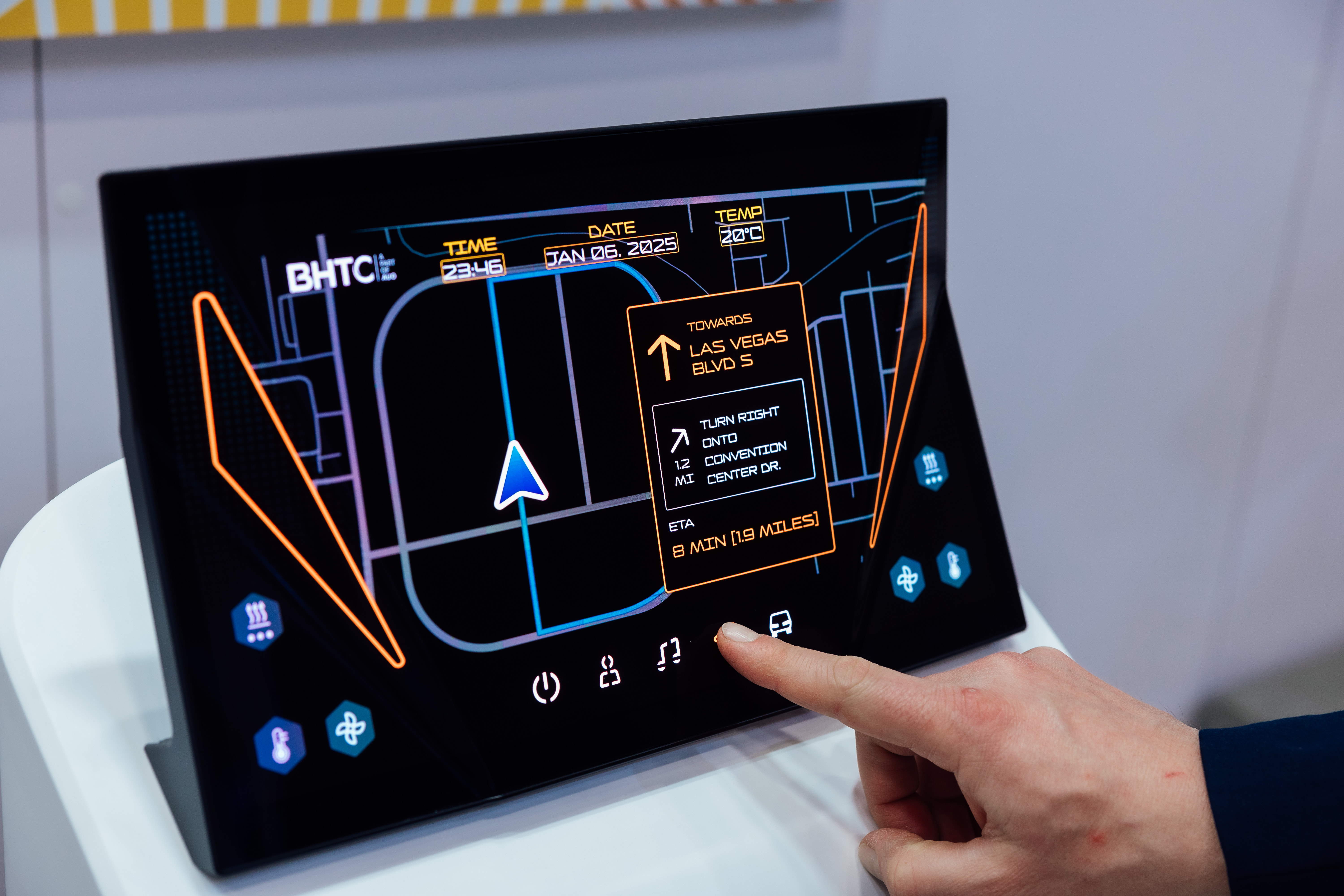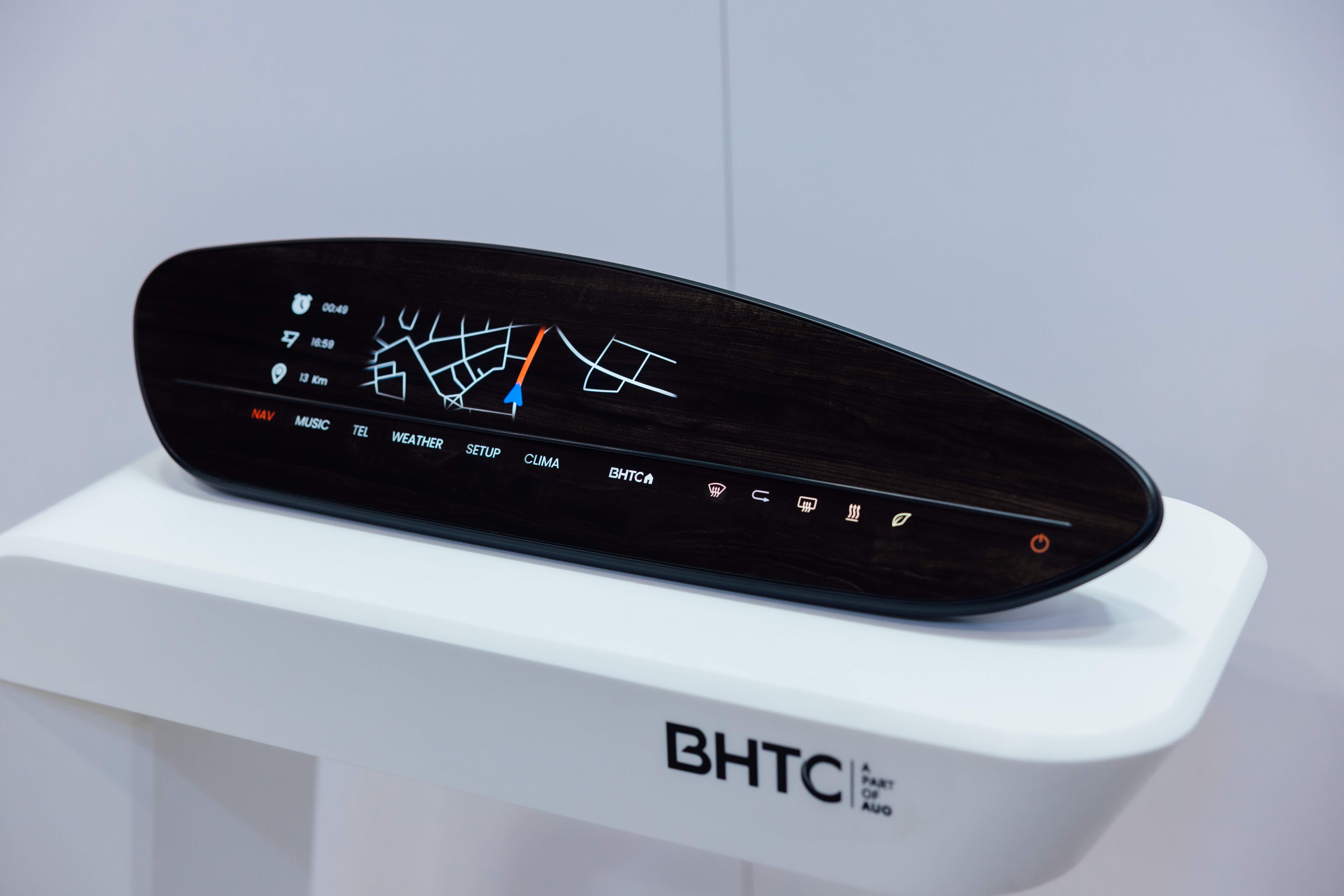 BHTC的木纹车用显示器(Display Behind Wood)将无缝木质表面与显示器结合后,可以融入车内设计中,提供驾驶优质的视觉效果,加上其无边框的设计和亮度调控,创造更优质的车内体验。