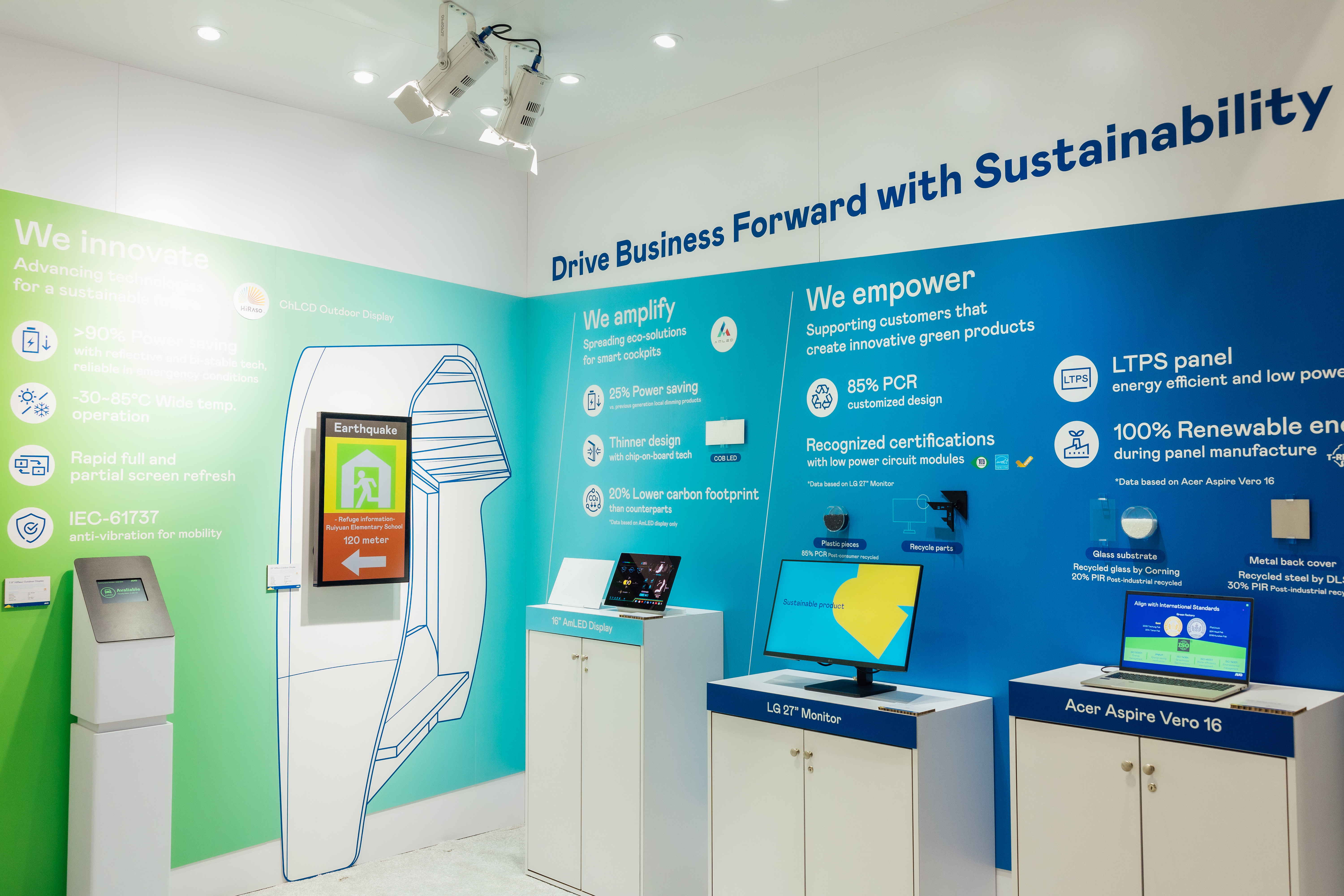 haobotiyu-好博(中国)运用创新显示技术HiRaso胆固醇液晶双稳态技术达到显示零耗能、扩大节能省电的AmLED显示技术应用于车用产品、以再生的消费后回收(PCR)塑料及全绿电生产之面板,应用于笔电及萤幕,增加绿色价值。